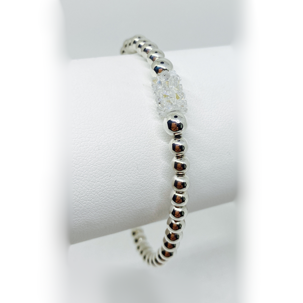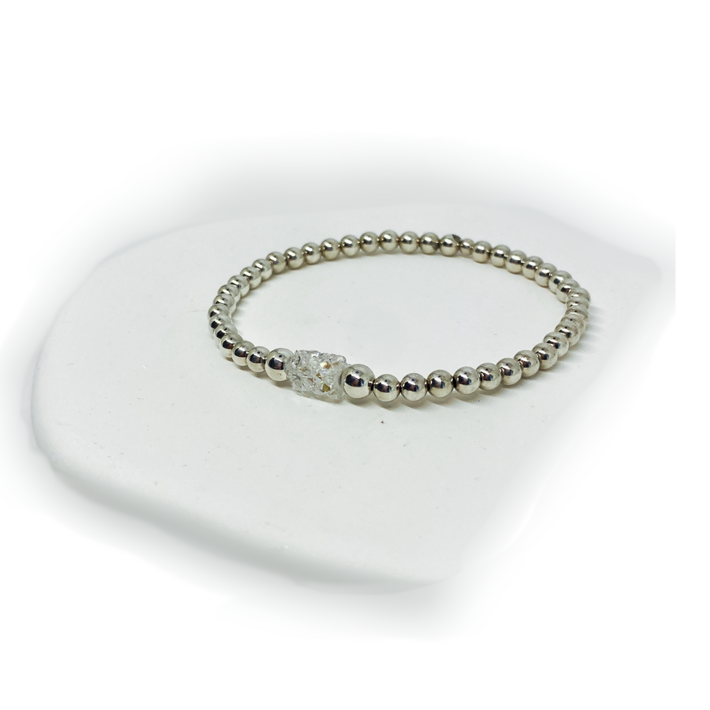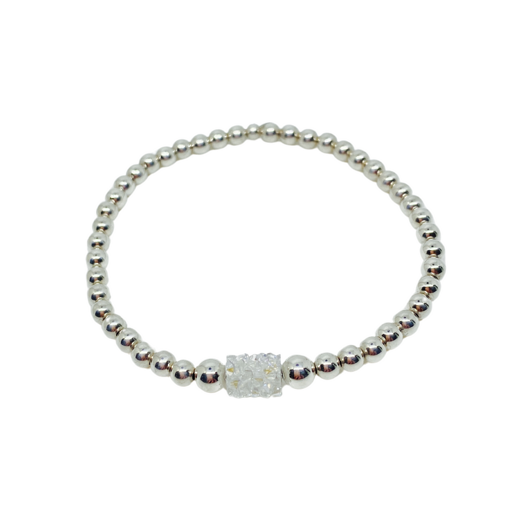 Beautiful 4mm sterling silver beaded stretch bracelet that's easy and comfortable to wear.  A bright, bold, and glittering crystal tube bead adds extra shine and dimension.  Layer it with other bracelets (literally any type will do!) so many options you can't go wrong.