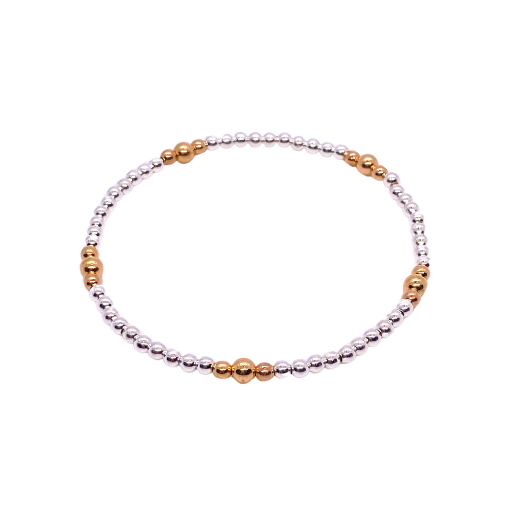 Beautiful 3mm Sterling Silver beads accented with 3mm & 4mm14K Gold-filled beads, strung on a study stretch cord.  This bracelet is easy and comfortable to wear.  Layer it with other bracelets (literally any type will do!) so many options you can't go wrong.