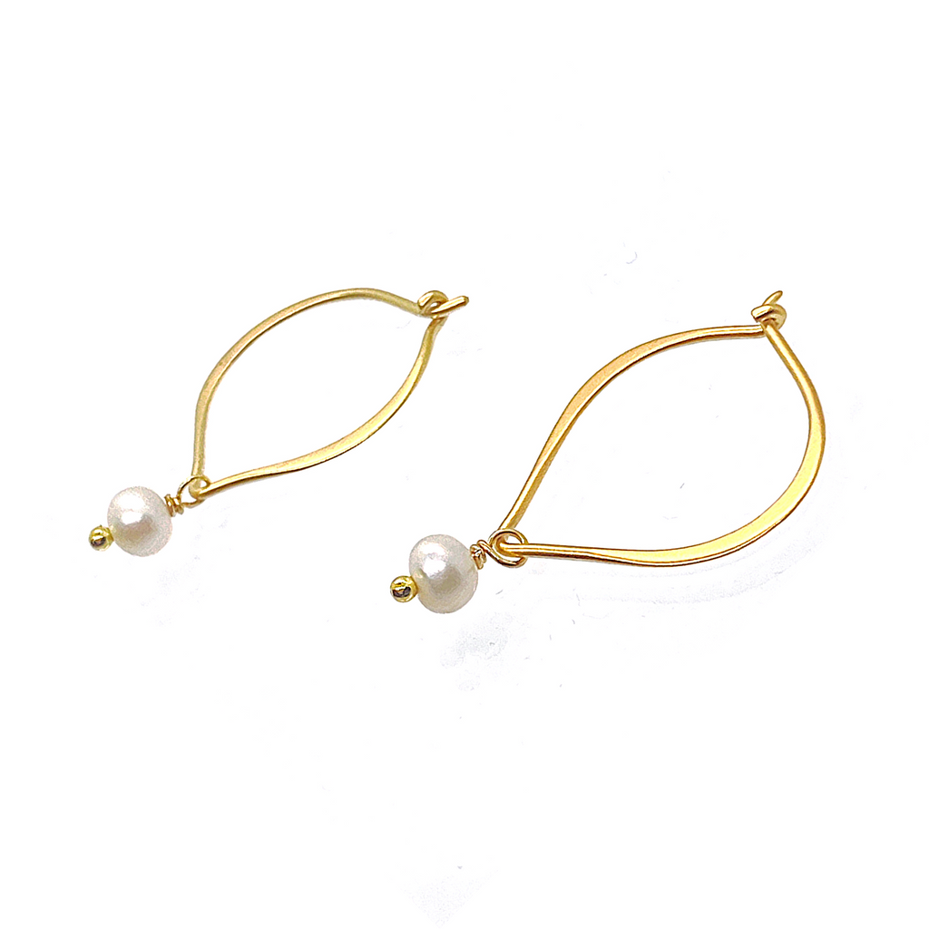 Unique in shape, these brushed gold marquise hoops are crafted in 18K gold plating with delicate freshwater cultured pearl drops. These multifunctional earrings can be worn with or without the pearl making them the perfect versatile earring.