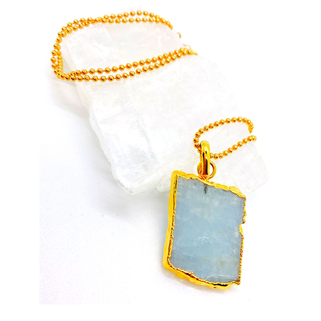 This stone is natural in shape and is reversible. A lovely unusual cut of aquamarine measures approx. 24mm X 18mm, and is encased in 18K gold plating. Beautiful and tranquil, this necklace speaks clarity and calmness.