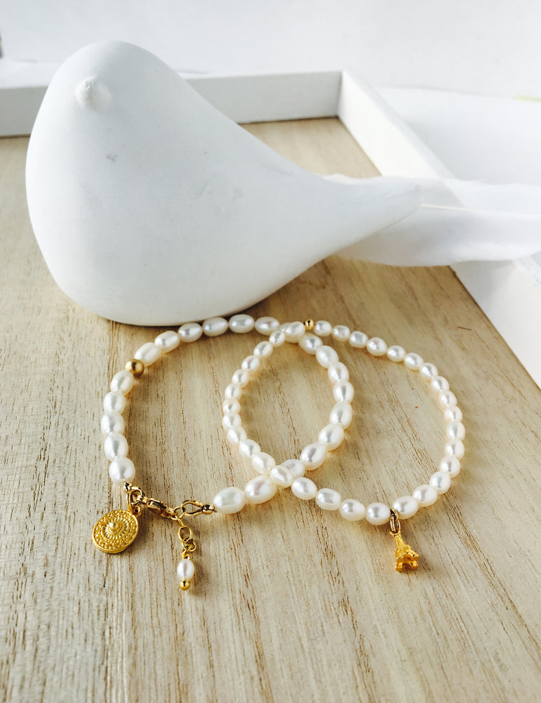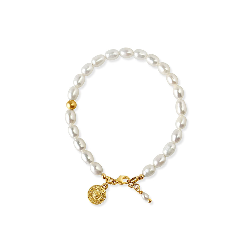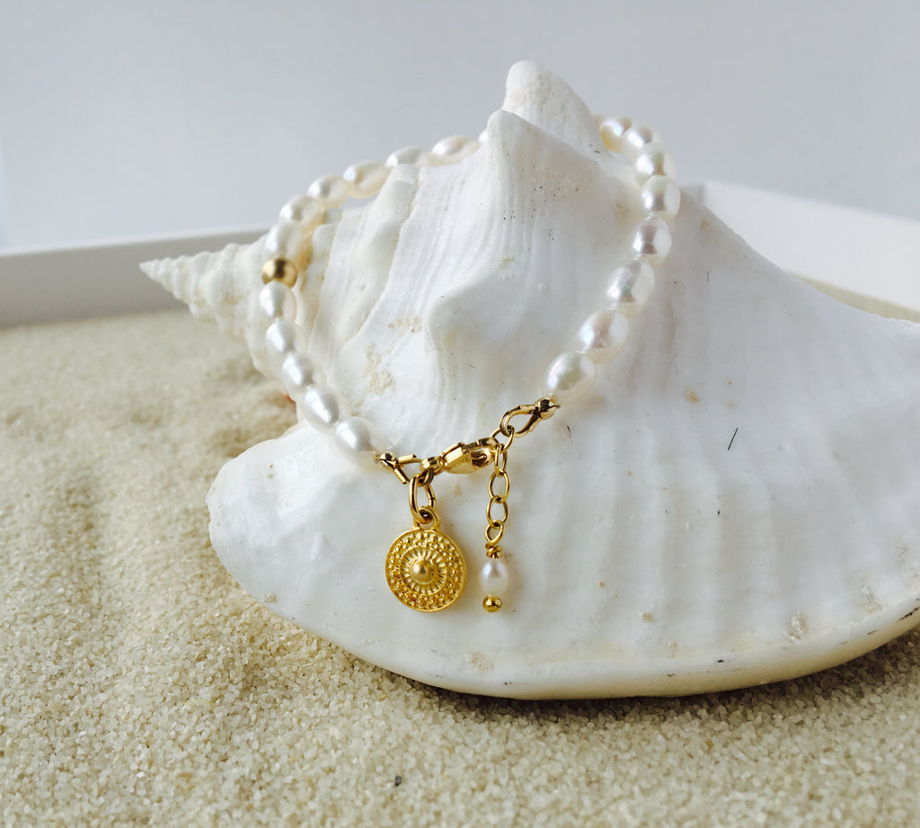 Pearls are a symbol of love; classic and timeless.  Paired with a mini gold plated medallion, this bracelet combines classic and modern design. The delicate style makes it easy to wear alone or to layer with other bracelets.