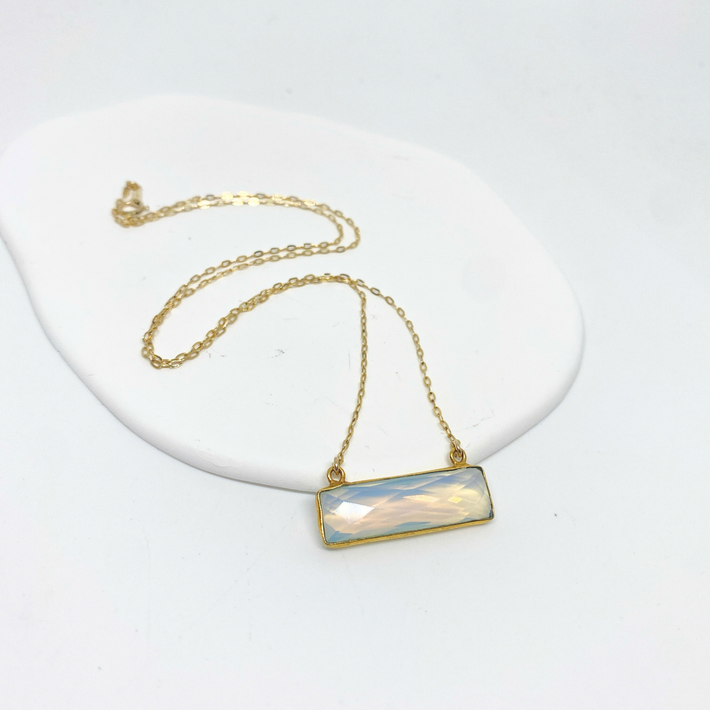 Adorn yourself with this ethereal Opalite gemstone necklace, featuring a delicate 18" gold-filled chain.  Opalite's iridescent glow captures a refined elegance that will illuminate any outfit.