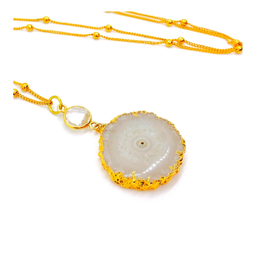 Solar Quartz Pendant measures approx. 30mm and is edged in 18K gold plating